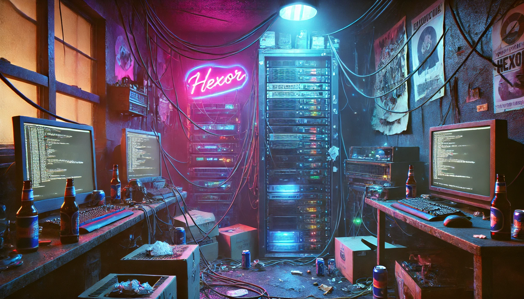 external_content/DALL·E 2025-03-17 22.47.34 - A photorealistic, wide-format image of a messy, neglected home server room in a gritty cyberpunk style. Neon lights cast eerie glows in blues, purples.webp